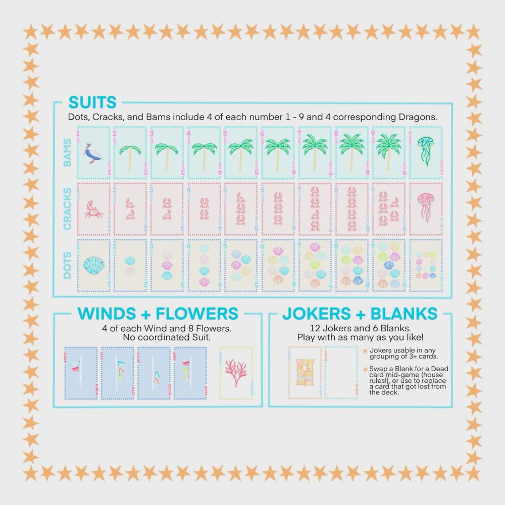 !!PRE-ORDER!! The estimated shipment date is August 1 2025. These mahjong playing cards are the perfect thing for vacations away when you can't bring your entire Mahjong set with you! Get ready to win in style with Play Away Mahjong Cards: Beach Edition! Palm trees, crabs, seashells, and more- perfect for any beach trip or summer getaway! Box includes 162 American Mahjong playing cards as well as Playing Instructions (both Traditional and Quick Play formats!) to get you out the door and ready to play ASAP! Our Mahjong cards are designed for beginners and on-the-go enthusiasts alike. No rack or mat necessary and line card is optional with Quick Play format. Best played by 2-4 players.